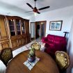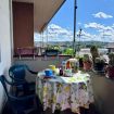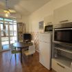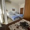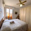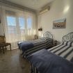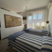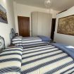 The apartment consists of two double bedrooms, a bathroom with bathtub, a second service bathroom, a third bedroom with two single beds, and a living area. There is a large terrace for outdoor dining, and a fully equipped kitchen with refrigerator, dishwasher, and oven, with access to a veranda.